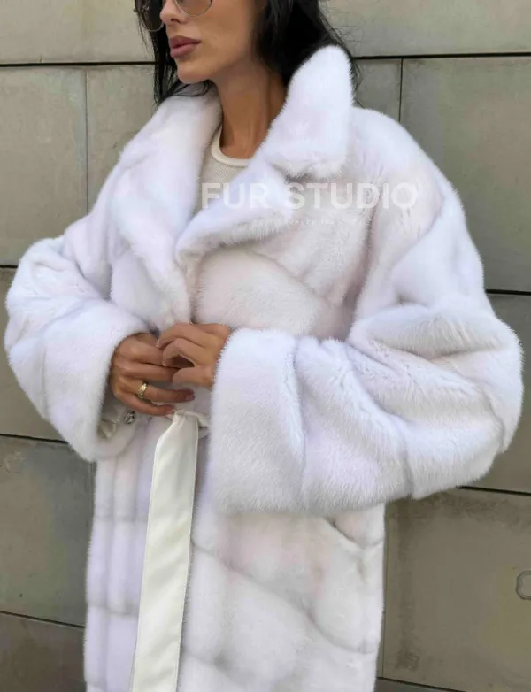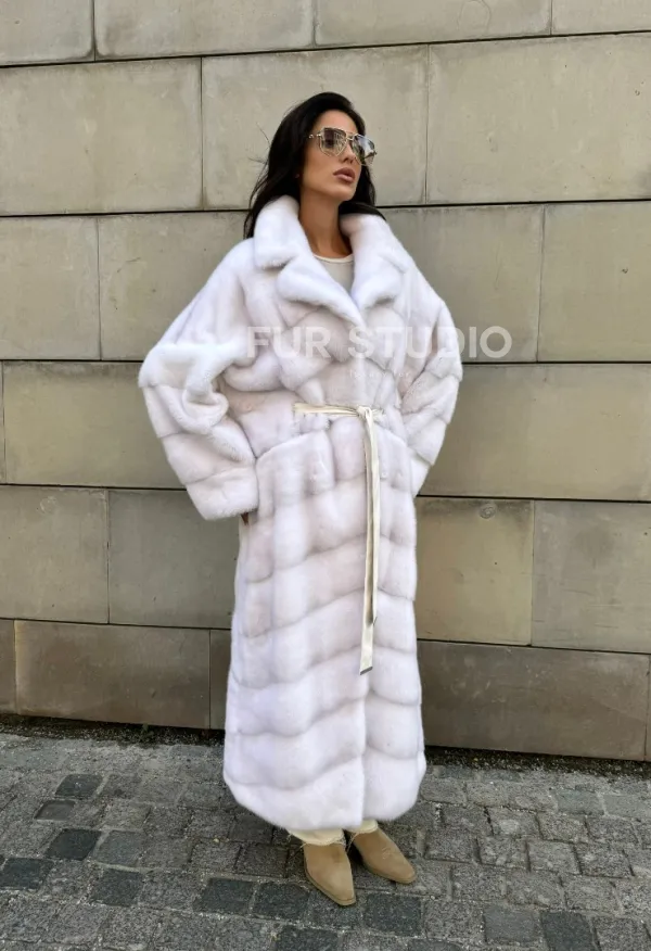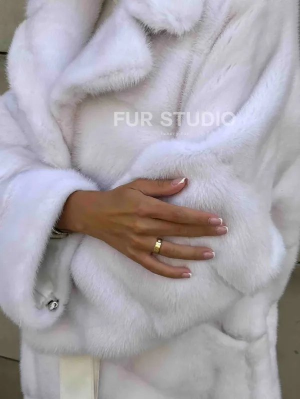 Мех данной шубы аукционная норка, цвет белый. Предлагается в размерах от 42 до 50. Длина модели 125-130 см, что выгодно подчеркивает фигуру девушек. Эта модель идеально подойдет для девушек и женщин, предпочитающих роскошные натуральные меха.