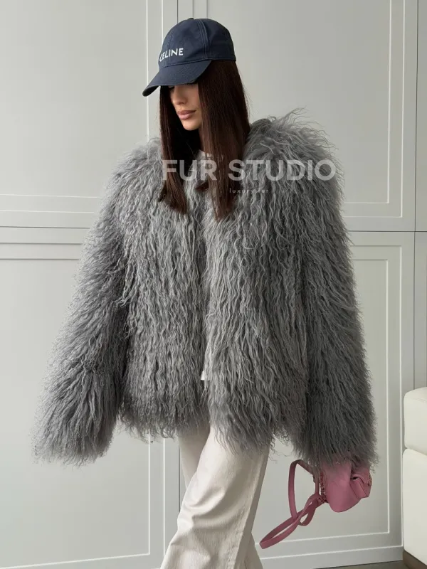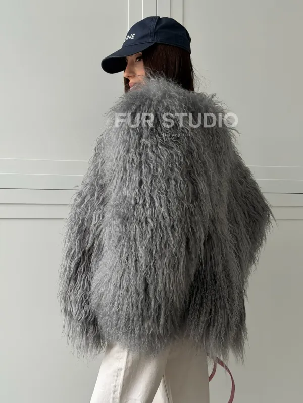 Серая шуба из натурального меха ламы 102811