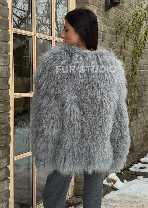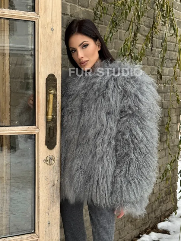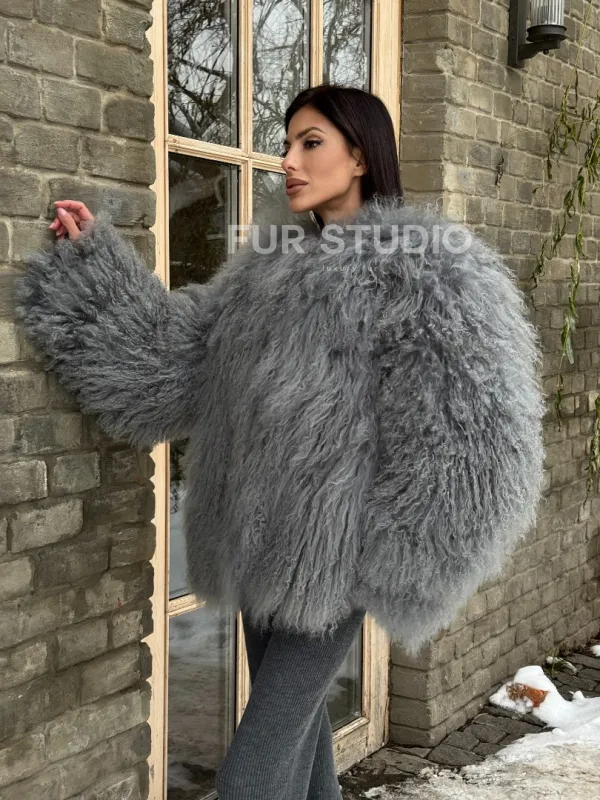 Шуба из меха ламы серого цвета 101435